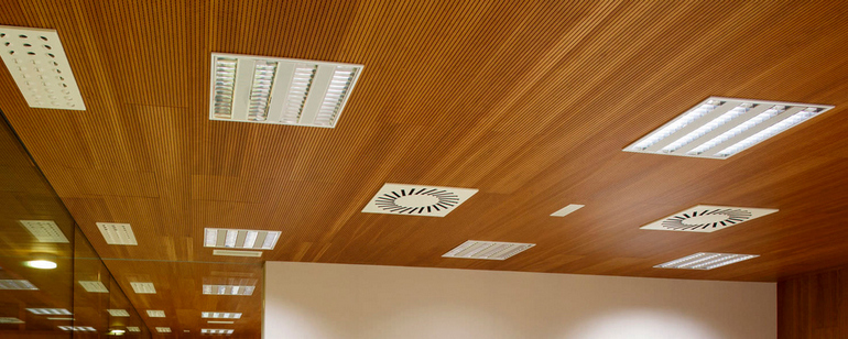 La madera está presente en la construcción desde el inicio de los tiempos y hoy por hoy, por los avances en I-D, tecnología de la producción y materiales, se consiguen falsos techos de madera y revestimientos con unos acabados espectaculares y que colaboran de forma determinante con el acondicionamiento acústico de los espacios donde son instalados pero a su vez, satisfaciendo exigentes prestaciones en diseños de acabado e interiorismo
