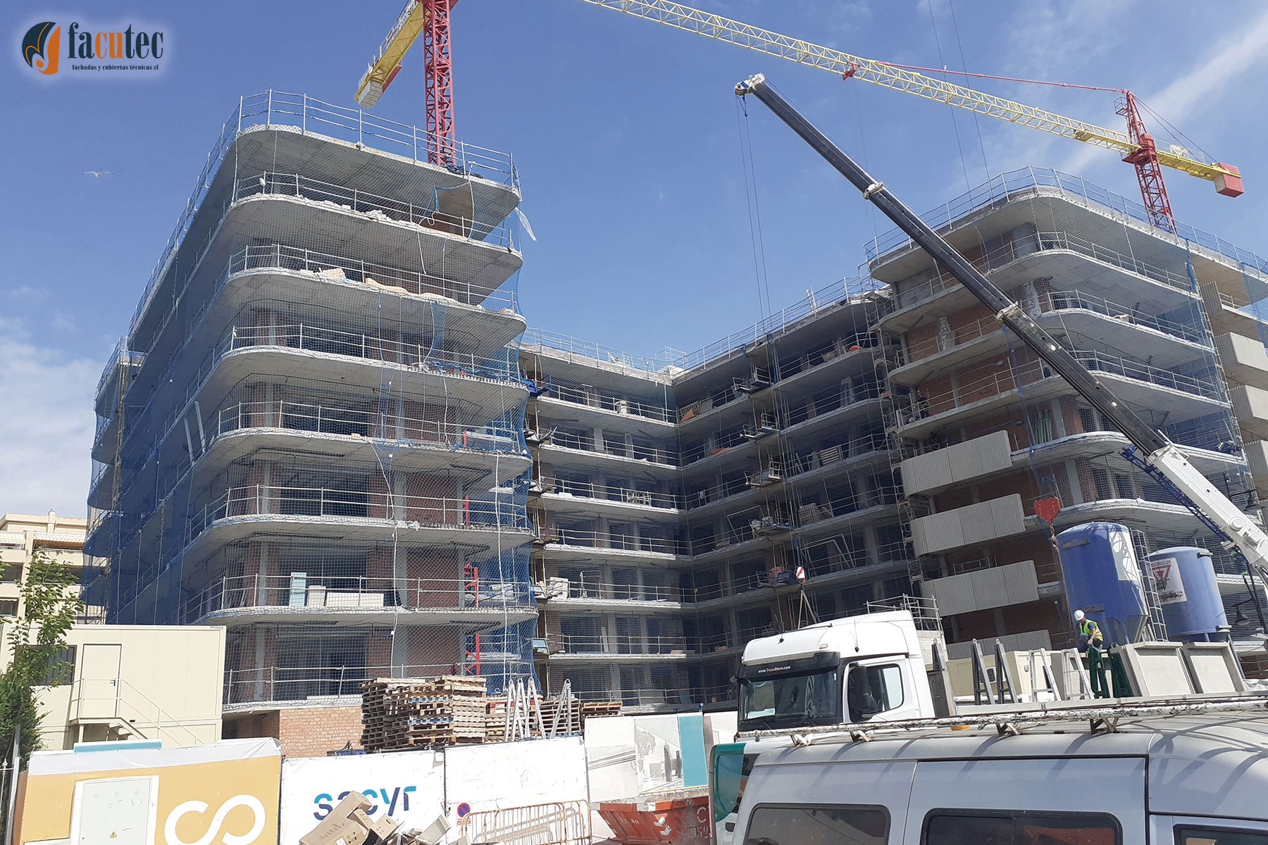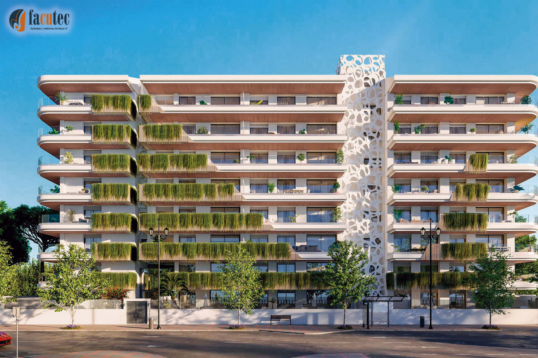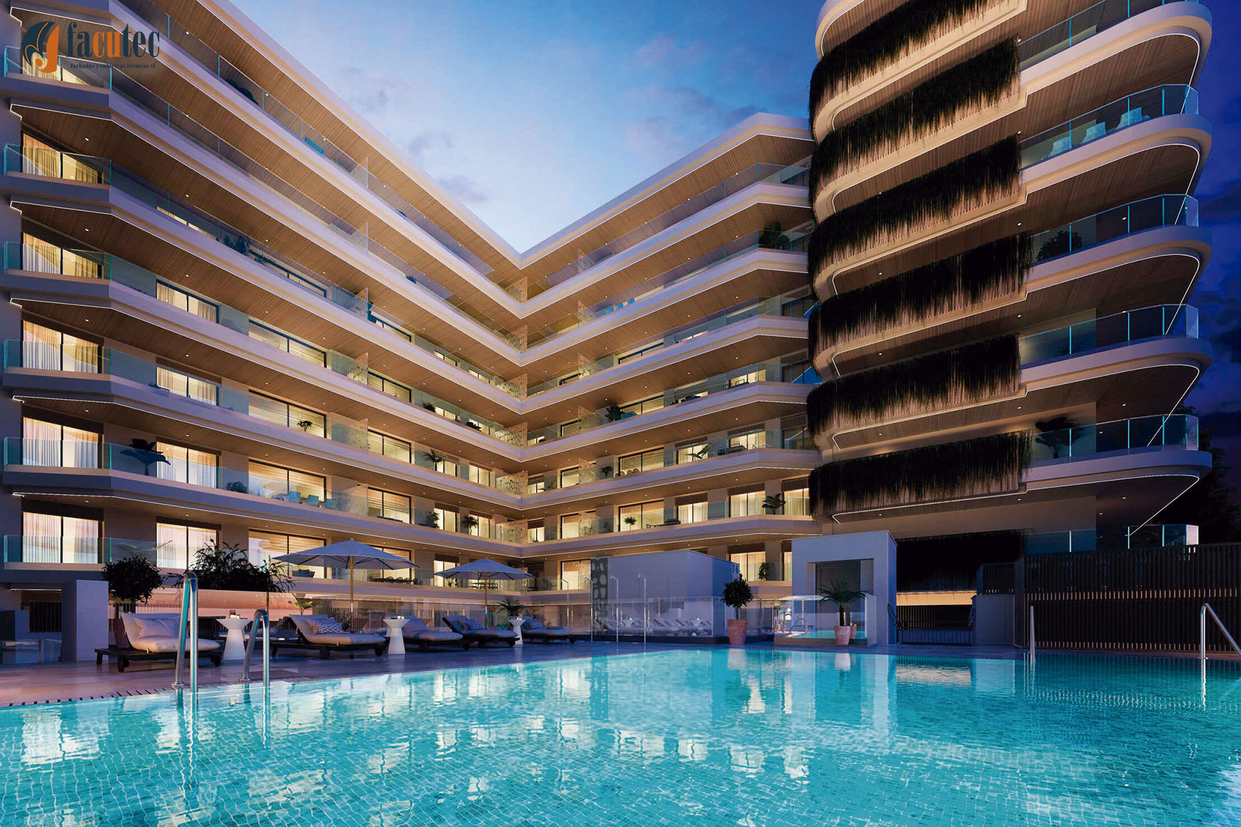 Tambien Facutec está presente en obras y proyectos en el litoral malagueño, en concreto, el pasado año 2024 Facutec participó en la instalación de los revestimientos y fachadas ventiladas de panel comprosite de aluminio en la obra de 116 viviendas en Fuengirola, conocidas como residencial Jade Tower