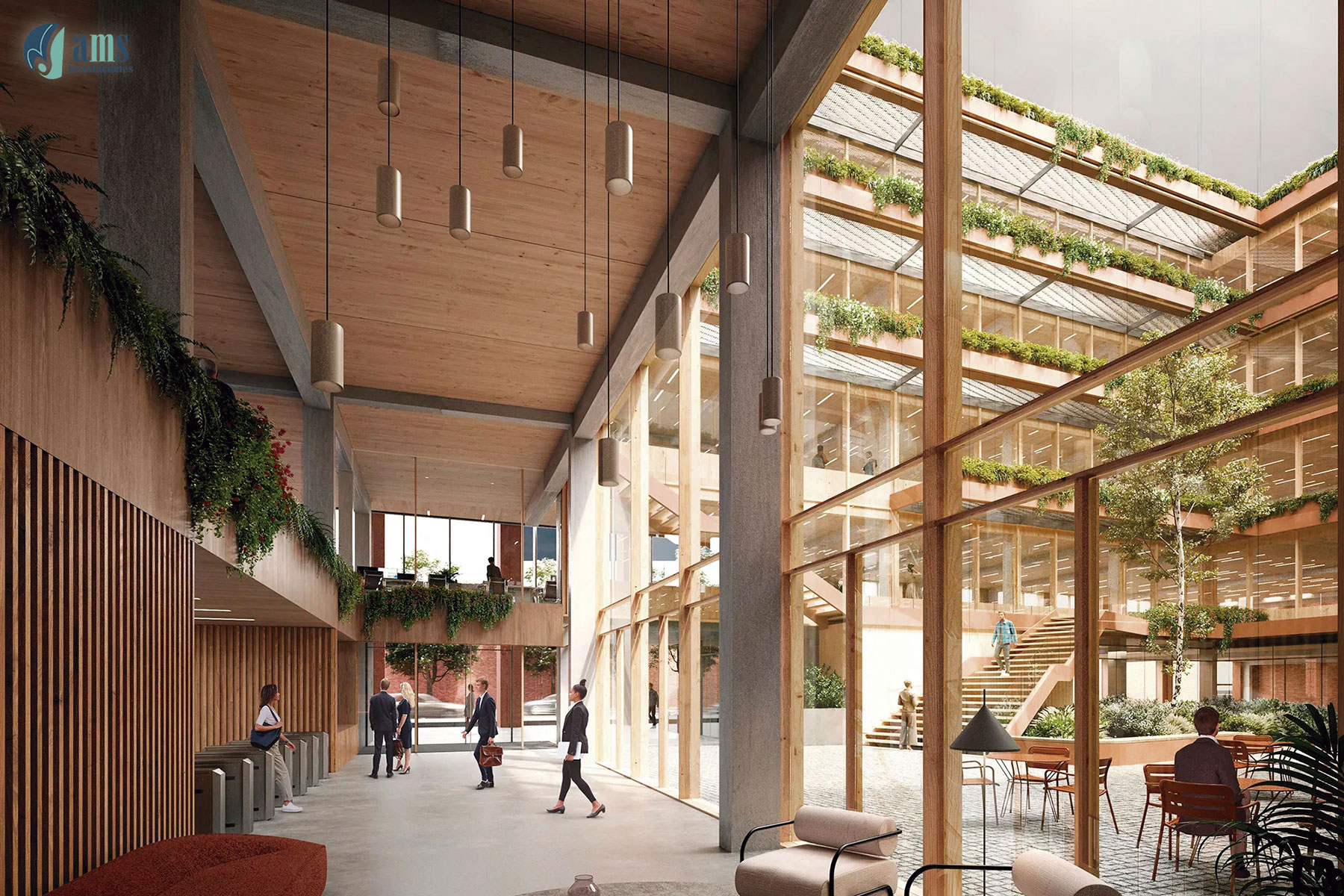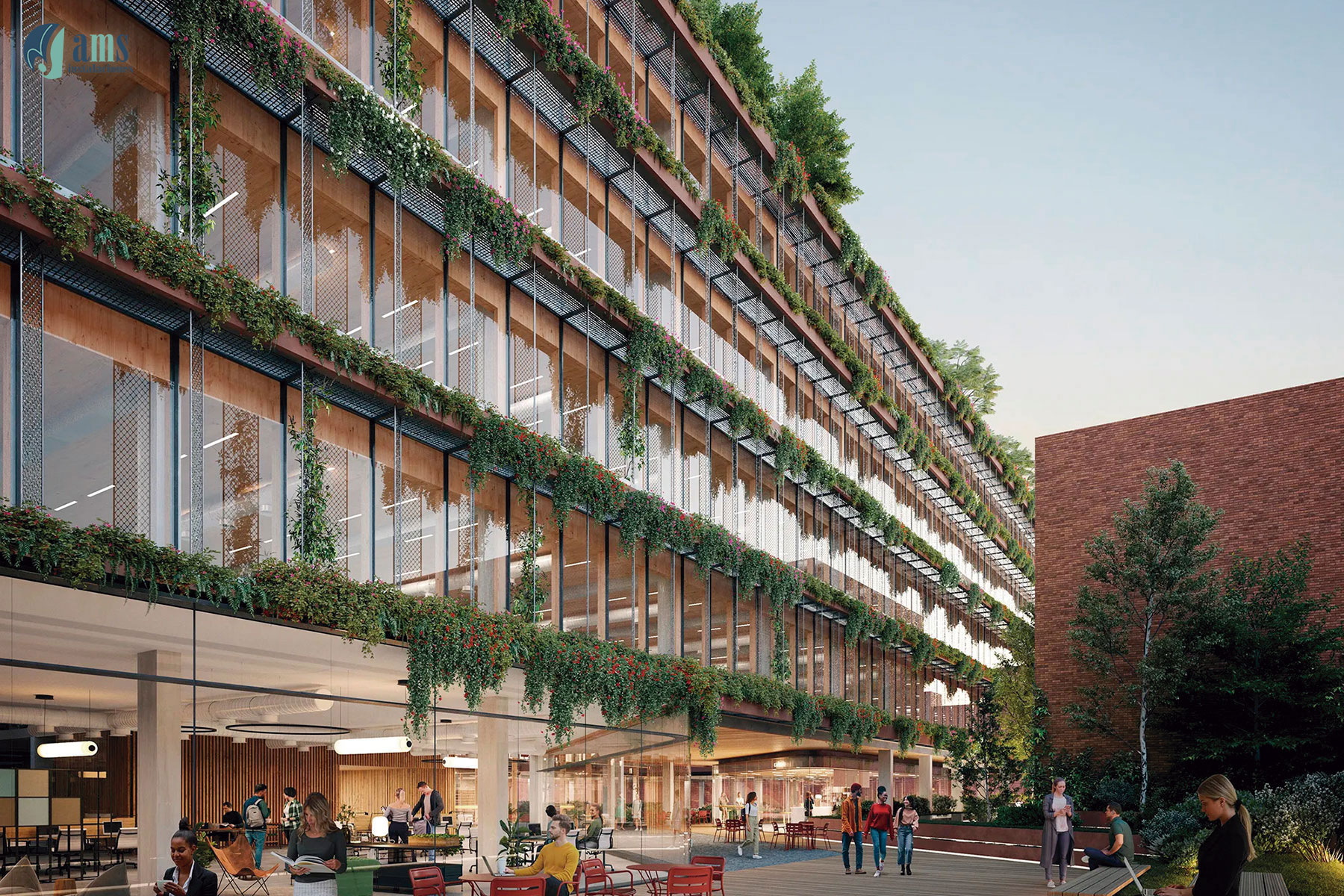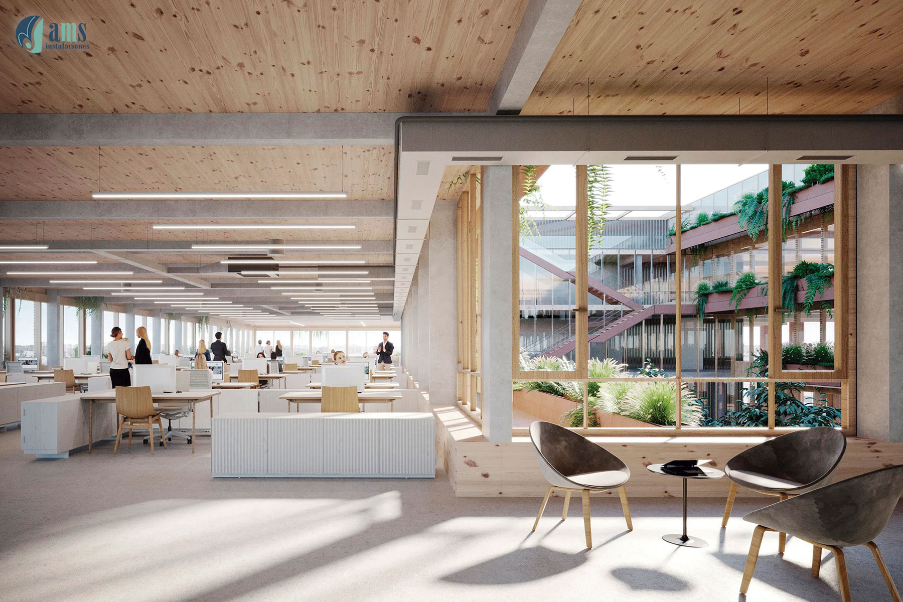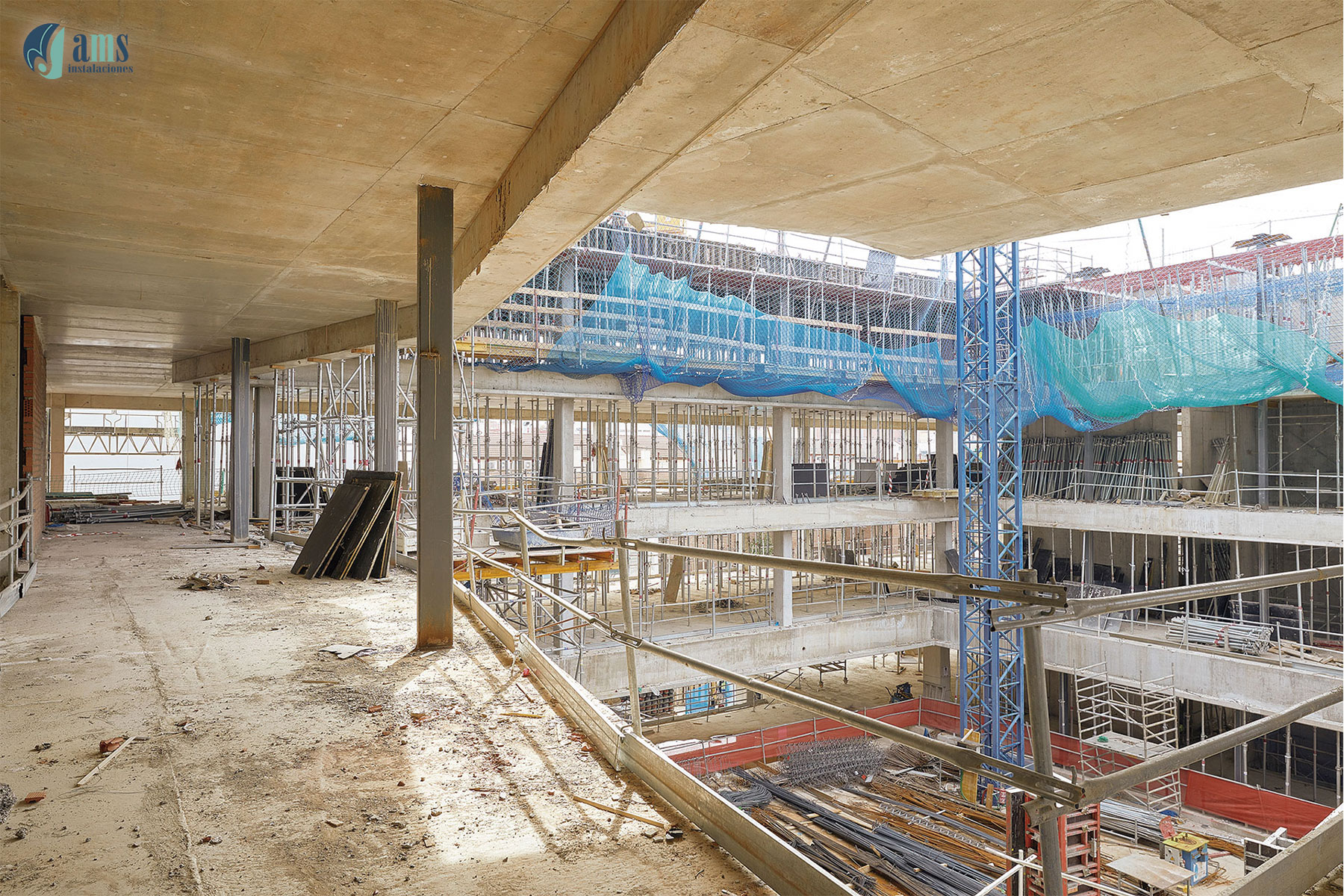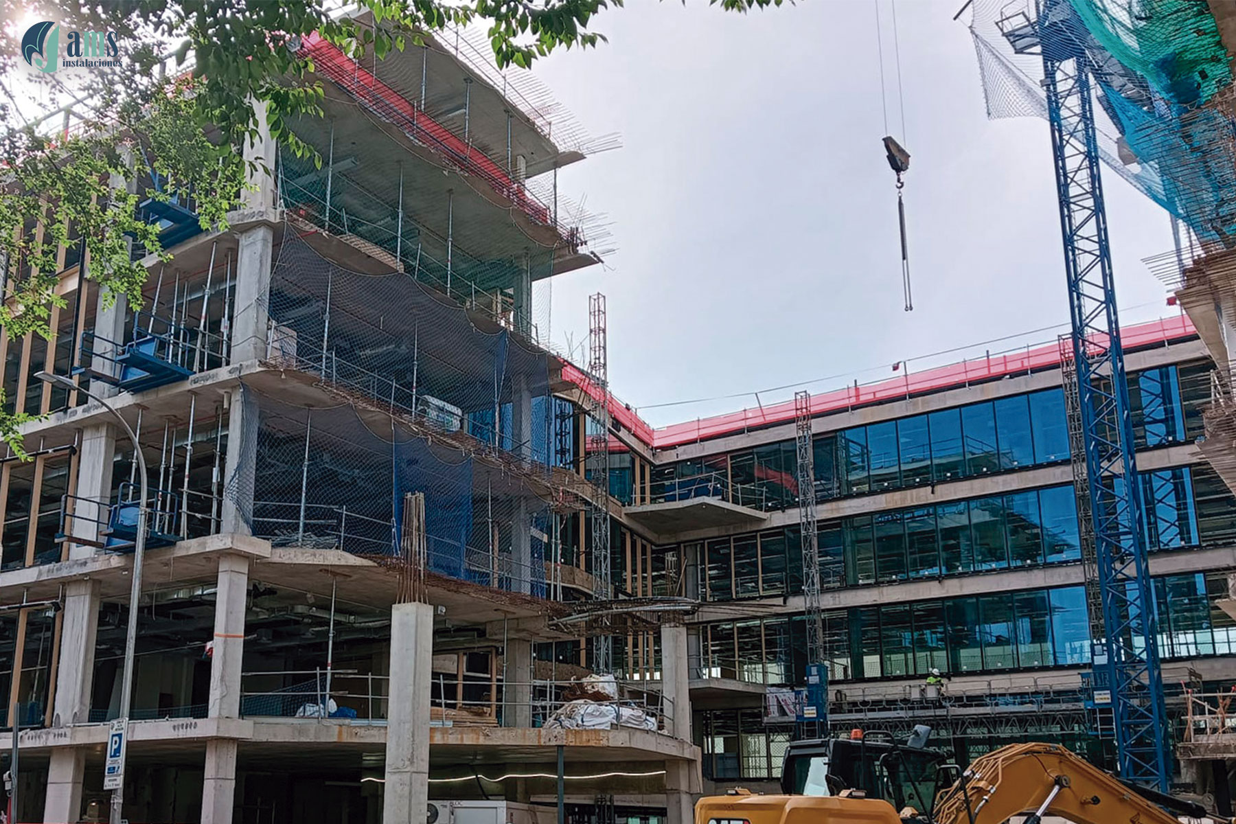 Otro de los proyectos del sector terciario en los que ha participado el Grupo AMS es la construcción de un edificio de oficinas en Madrid, en la c/ Pradillo, donde nuestra instaladora AMS Instalaciones ha participado en el año 2025 con la instalación de los sistemas de yeso laminado (tabiquería, trasdosados, falsos techos), falsos techos metálicos, soluciones de aislamiento termo-acústicos y los sistemas de compartimentación relacionados con la protección pasiva contra incendios.