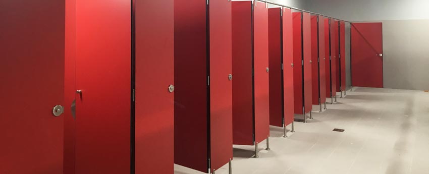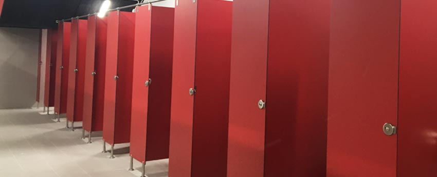 Así mismo se han ejecutado varias instalaciones con multitud de cabinas sanitarias en paneles fenólicos de color rojo corporativo que han resultado francamente espectaculares, no solo por las prestaciones sino por los acabados.